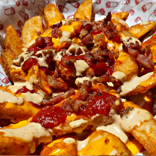 Papas sazonadas, queso amarillo, tocino y ahogo.