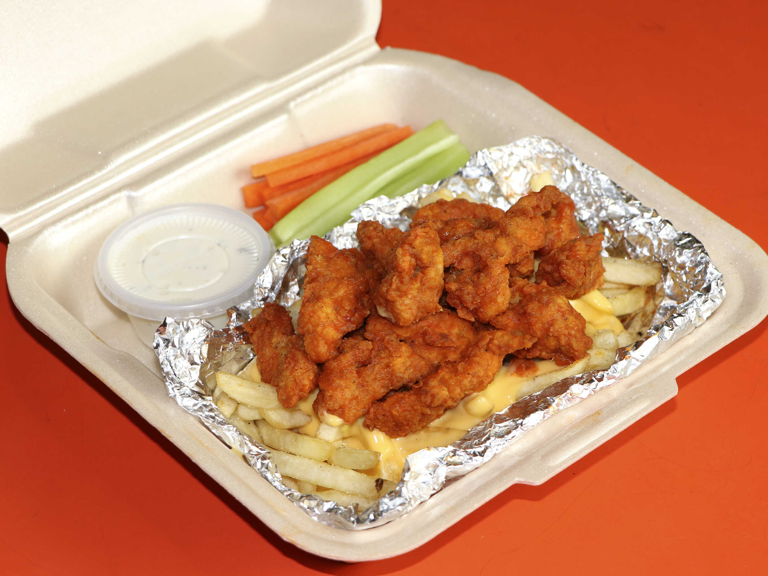 300 gr de papas a la francesa (con queso), 150 gr boneless y un aderezo ranch