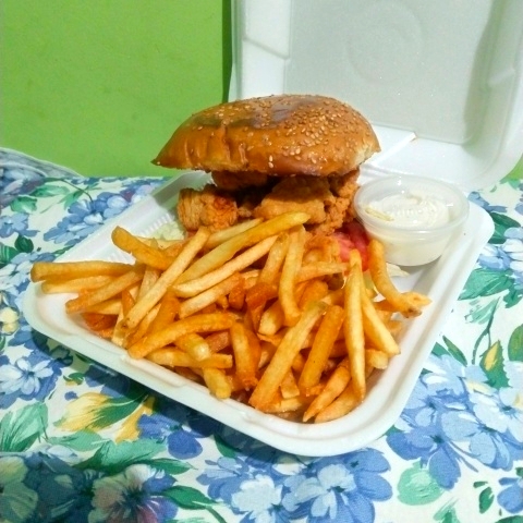 Hamburguesa de boneless con lechuga, tomate, cebolla, mayonesa, y papas fritas acompañadas de aderezo ranch.