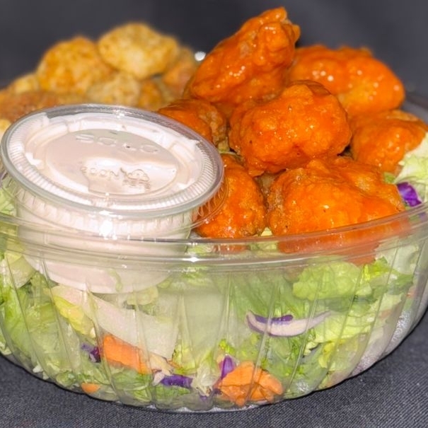 MIX DE LECHUGA , 200 GRS DE BONELESS CON SALSA DE SU ELECCION BUFALLO,BBQ,COKIE,CROUTONES Y ADEREZO RANCH