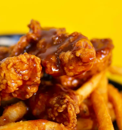 200 gr de boneless y 170 gr de papas francesas, bañados en la salsa de tu elección, acompañados de 4 oz de aderezo de la casa y 2 oz de queso amarillo. para una persona