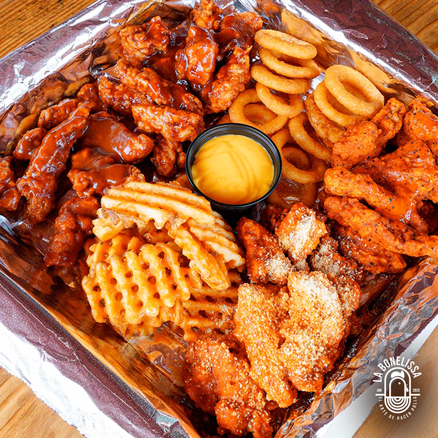 1.5 kg de boneless, 250 gr de papas crisscut + 12 piezas de aros de cebolla + 1 queso + 4 aderezos de la casa apio y zanahoria.