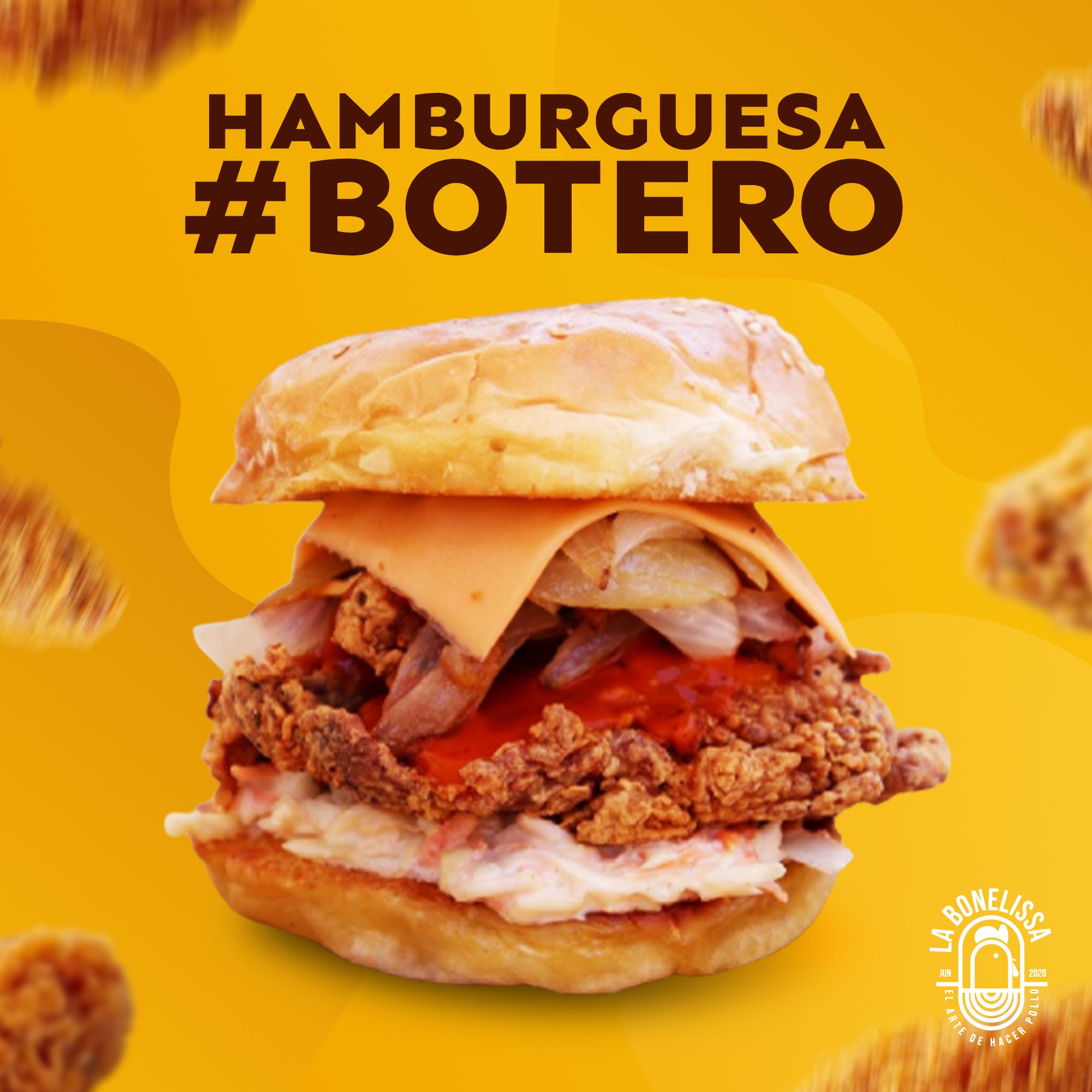 150 gr de pollo, empanizado natural, aderezo mil islas, pepinillos, lechuga, queso para nachos y cebolla con tocino.