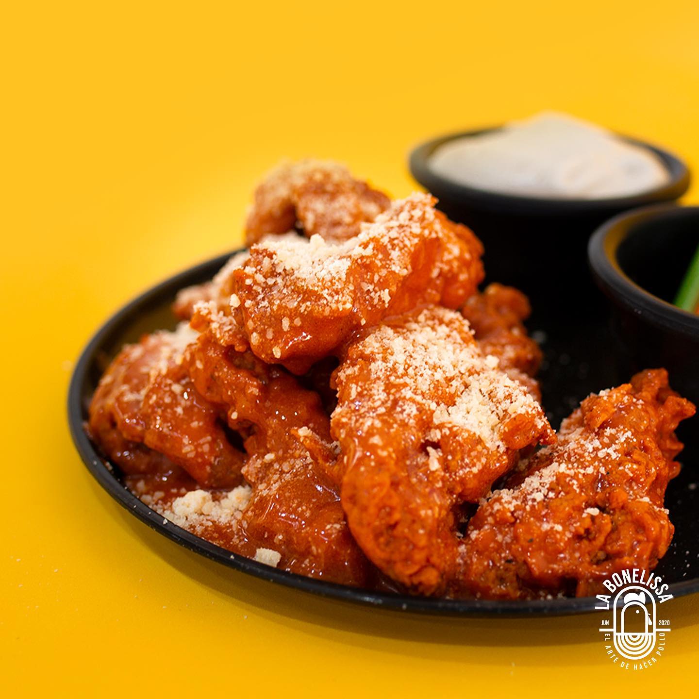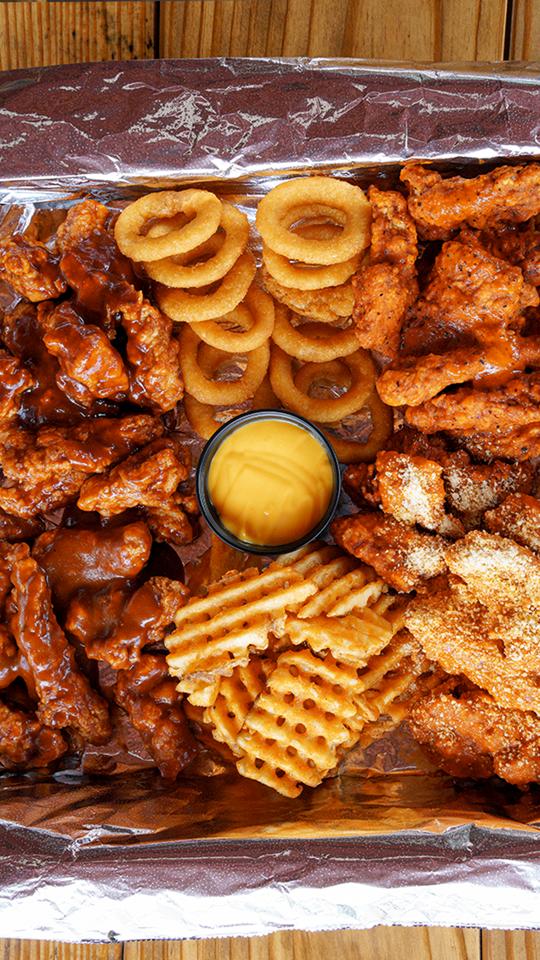 1.5 kg de boneless, 250 gr de papas crisscut + 12 piezas de aros de cebolla + 1 queso + 4 aderezos de la casa, apio y zanahoria.