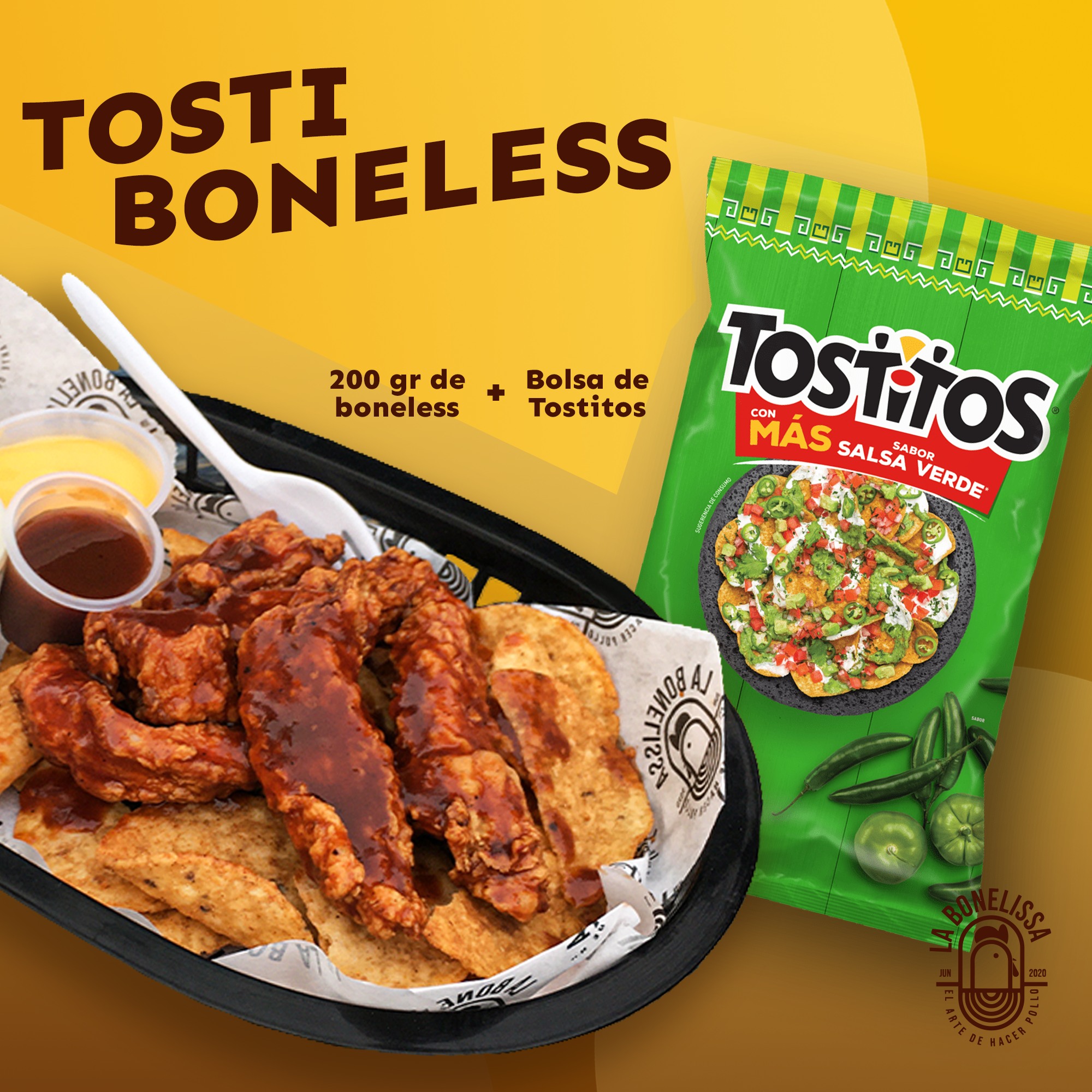 200 gr de boneless y una bola de tostilos, acompañados de 2 oz de queso amarillo y 4 oz de aderezo.