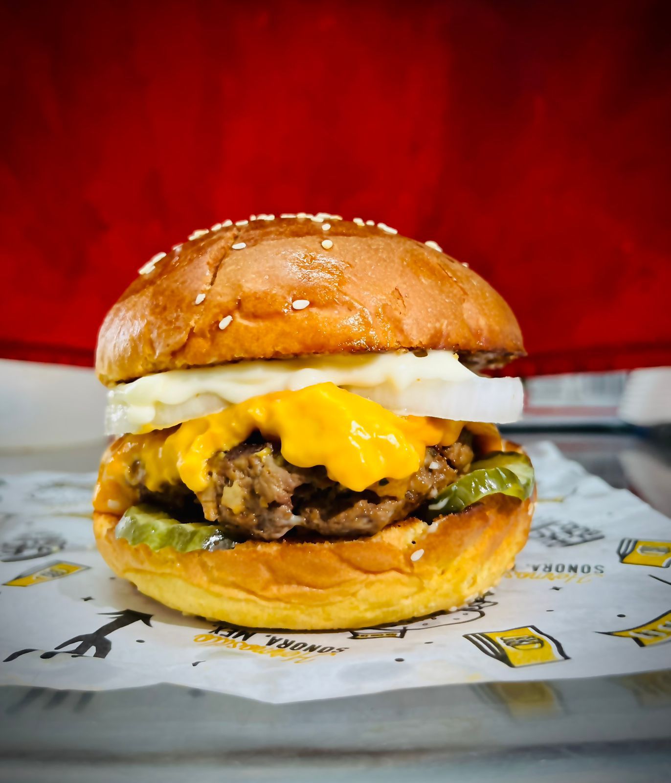 Carne de res , doble queso amarillo, guacamole, chile guerito y tocino.