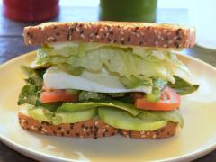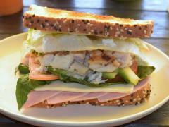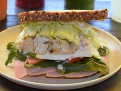 Dos rebanadas de pan multigrano, lechuga, espinacas, tomate, pimiento y mayonesa. Pechuga de pollo 45 gramos, dos rebanadas de jamón de pavo y queso panela. Incluye aguacate y aderezo ranch.