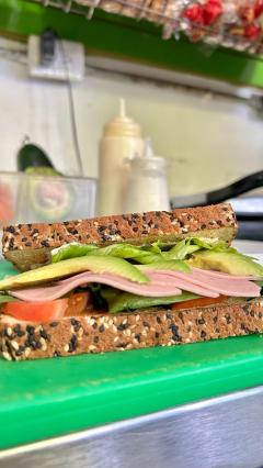 Dos rebanadas de pan multigrano, lechuga, espinacas, tomate, pimiento y mayonesa. Pechuga de pollo 45 gramos, dos rebanadas de jamón de pavo y queso panela. Incluye aguacate y aderezo ranch.