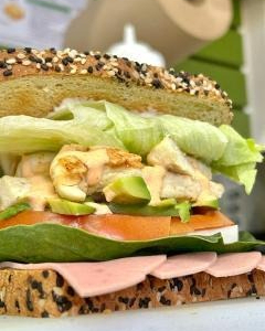 Dos rebanadas de pan multigrano, lechuga, espinacas, tomate, pimiento y mayonesa. Pechuga de pollo 45 gramos, dos rebanadas de jamón de pavo y queso panela. Incluye aguacate y aderezo ranch.