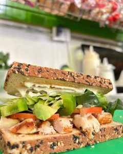 Dos rebanadas de pan multigrano, lechuga, espinacas, tomate, pimiento y mayonesa. Pechuga de pollo 35 gramos y queso mozarella.