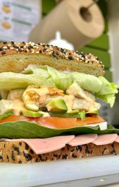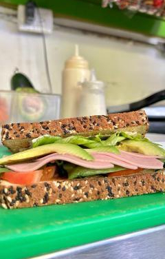 Dos rebanadas de pan multigrano, lechuga, espinacas, tomate, pimiento y mayonesa. Pechuga de pollo 45 gramos, dos rebanadas de jamón de pavo y queso panela. Incluye aguacate y aderezo ranch.