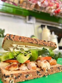 Dos rebanadas de pan multigrano, lechuga, espinacas, tomate, pimiento y mayonesa. Pechuga de pollo 35 gramos y queso mozarella.