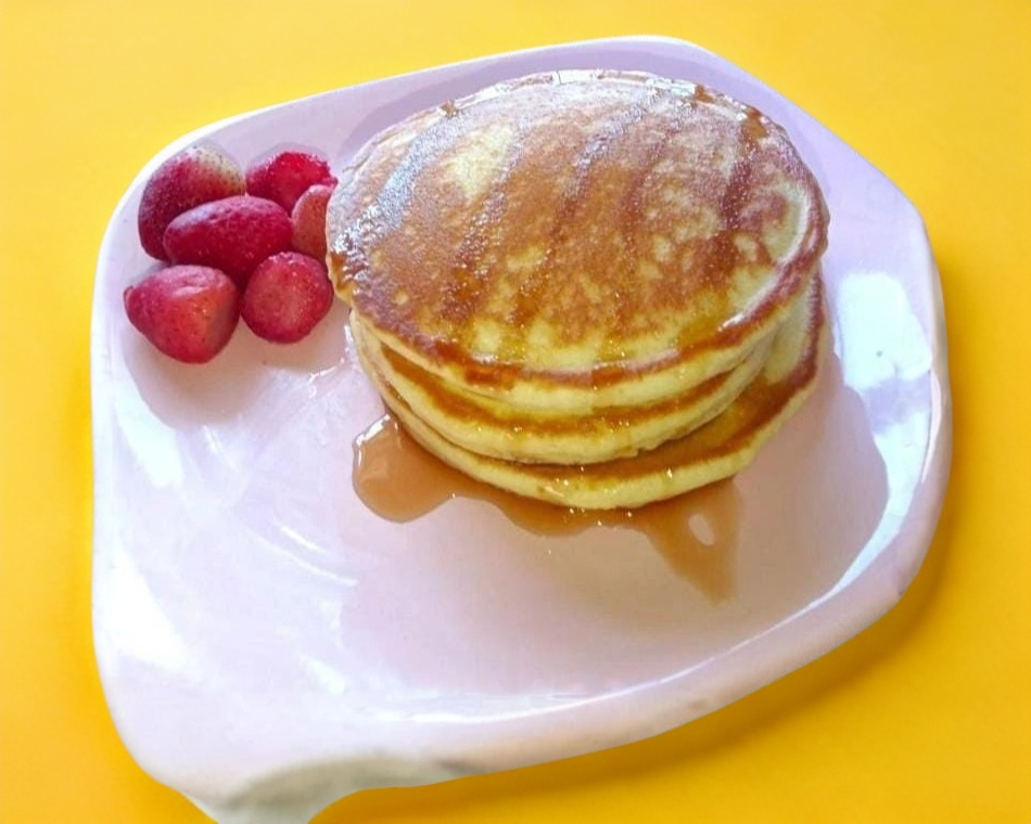 3 hot cackes acompañados con fruta de temporada, elige entre miel de maple o abeja. Agrega proteína: huevo por $20 extra.