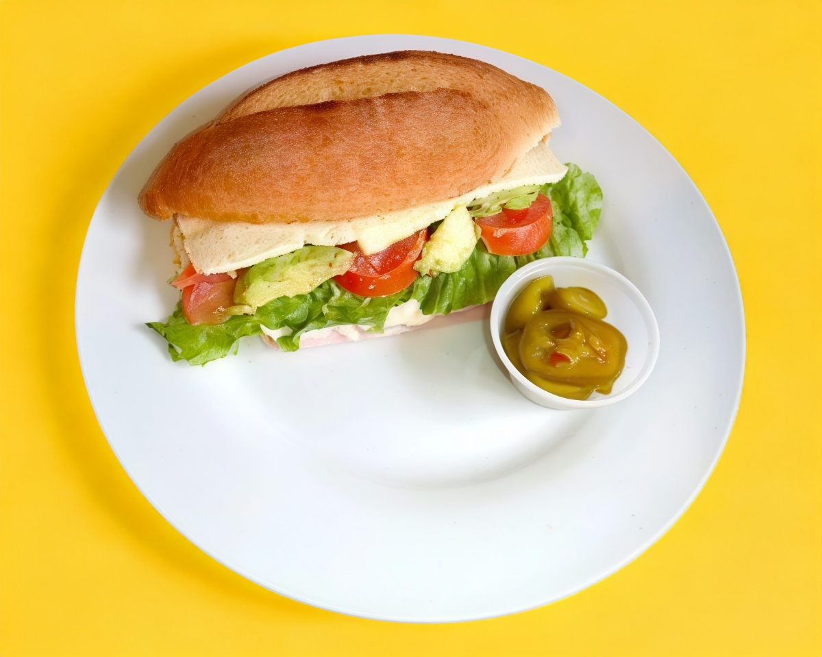 Jamón de pavo, queso americano, queso chihuahua, lechuga, tomate, aguacate, mantequilla y mayonesa.