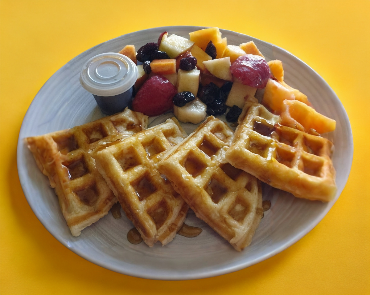 Una porción de waffle, elige miel de maple o abeja, acompaña con fruta de temporada. Agrega proteína, huevo por 20 extra.