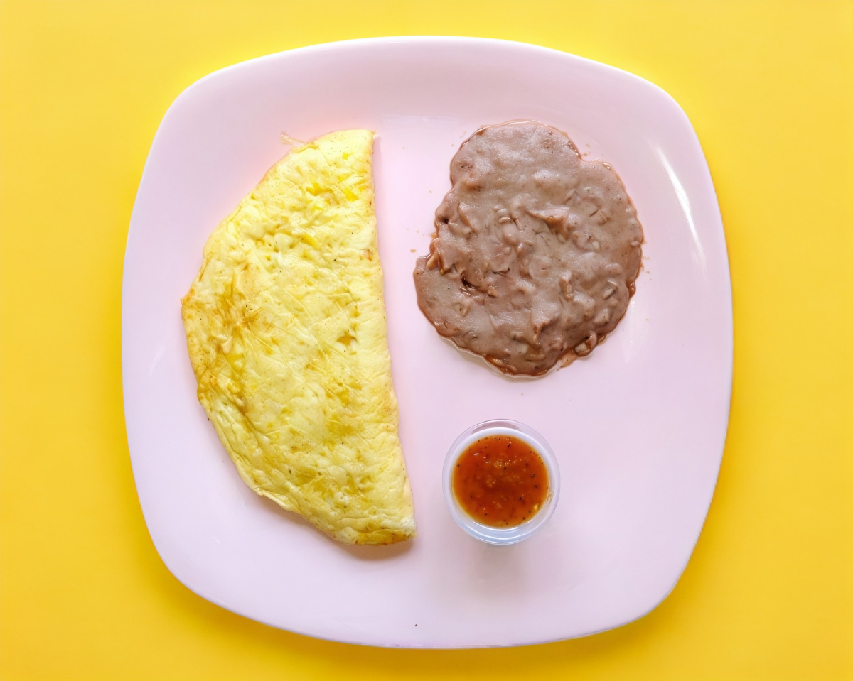 2 Huevos con queso y 2 ingredientes a elegir, jamón, salchicha, tocino, chorizo o machaca. Acompaña con frijoles, tortilla de maíz, harina o pan tostado.