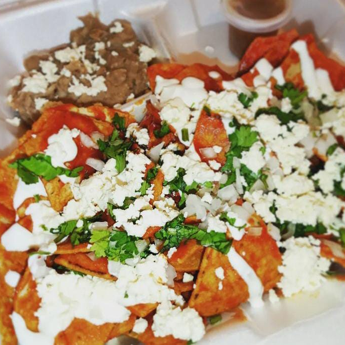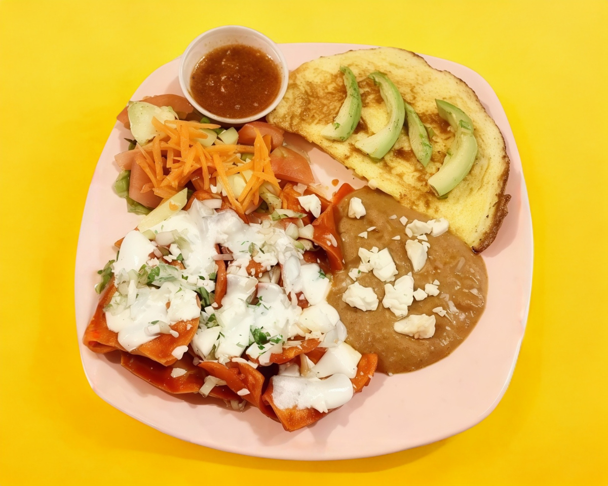Totopos bañados en salsa roja, verde o mixta. Acompaña con cebolla, cilantro, queso, crema y frijoles. Agrega proteína: huevo o pollo por $30 extra.