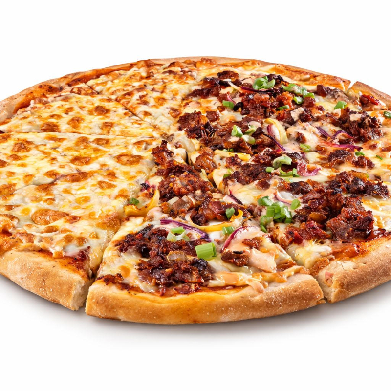 Base de salsa BBQ de la casa, pulled pork, cebolla morada, chile caribe, pimiento rojo y mezcla de quesos.