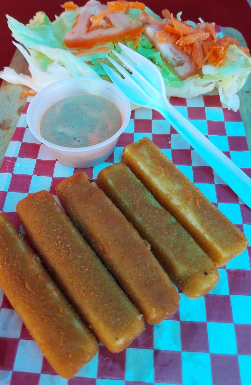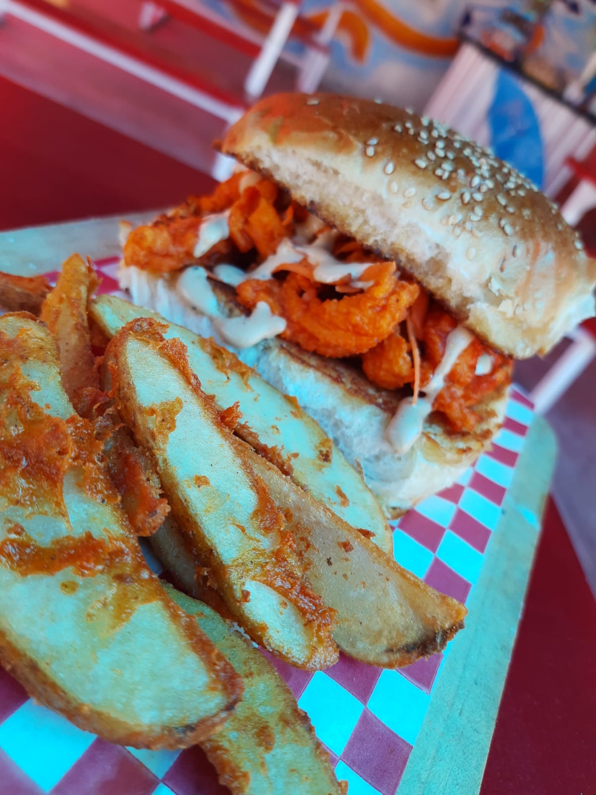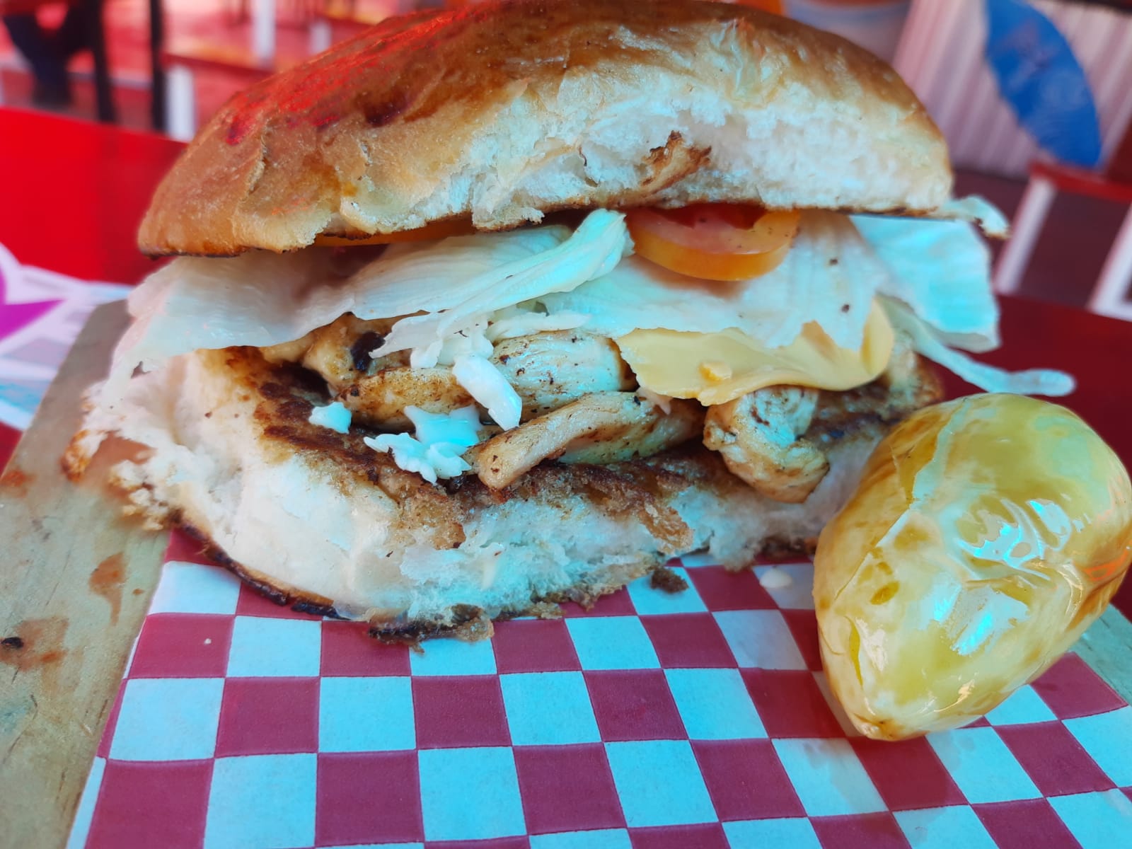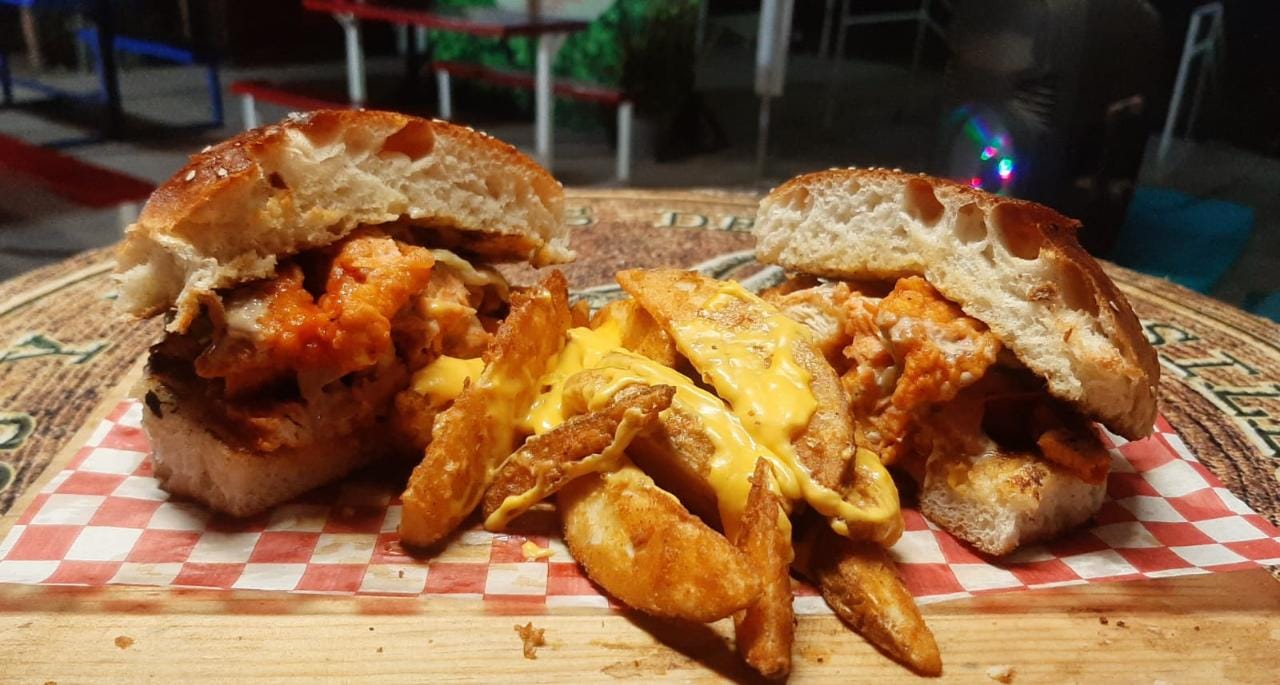 Pan hamburguesa, boneless (120 gr), zanahoria, tomate, lechuga y aderezo, acompañada con papas sazonadas.