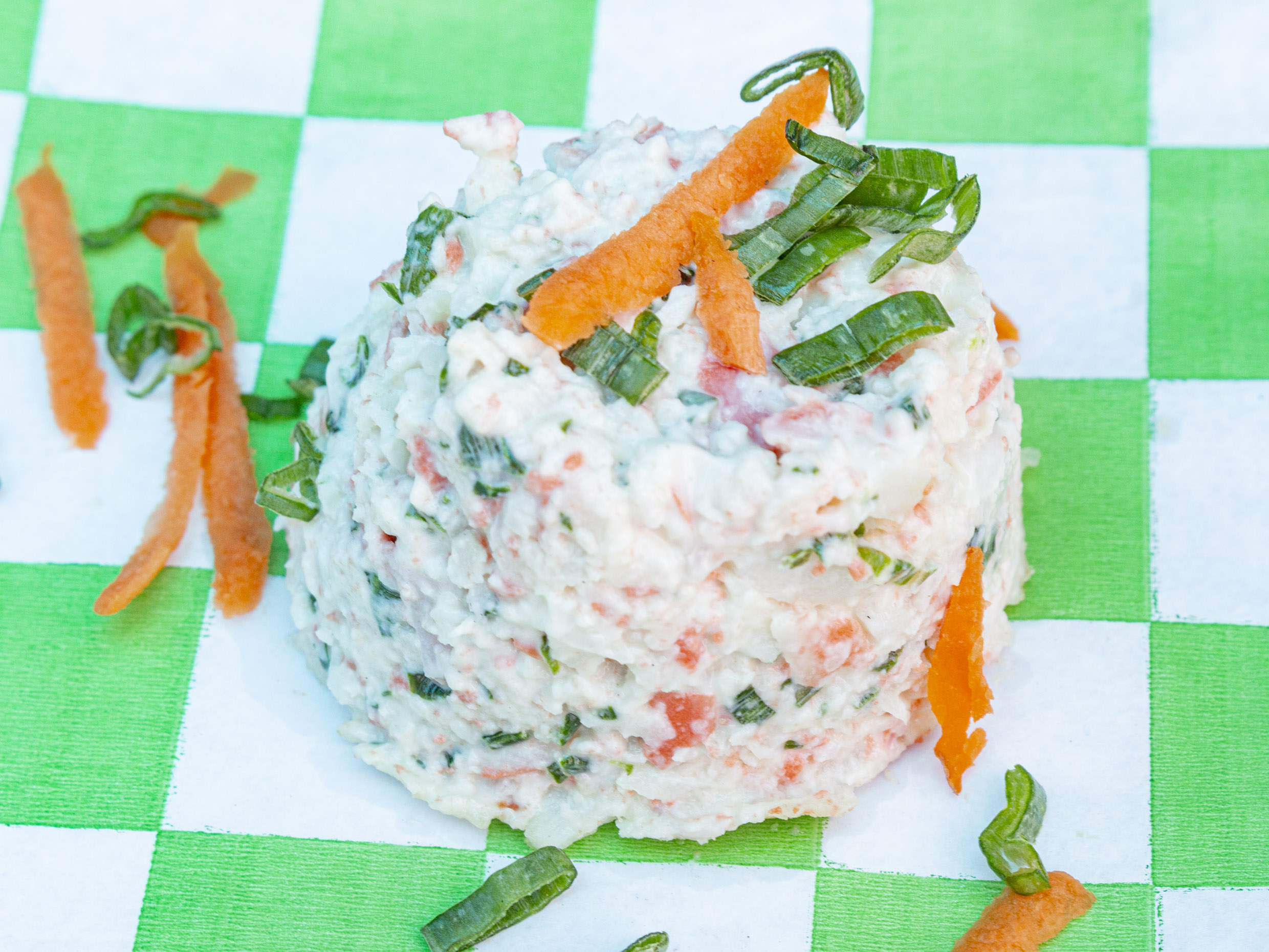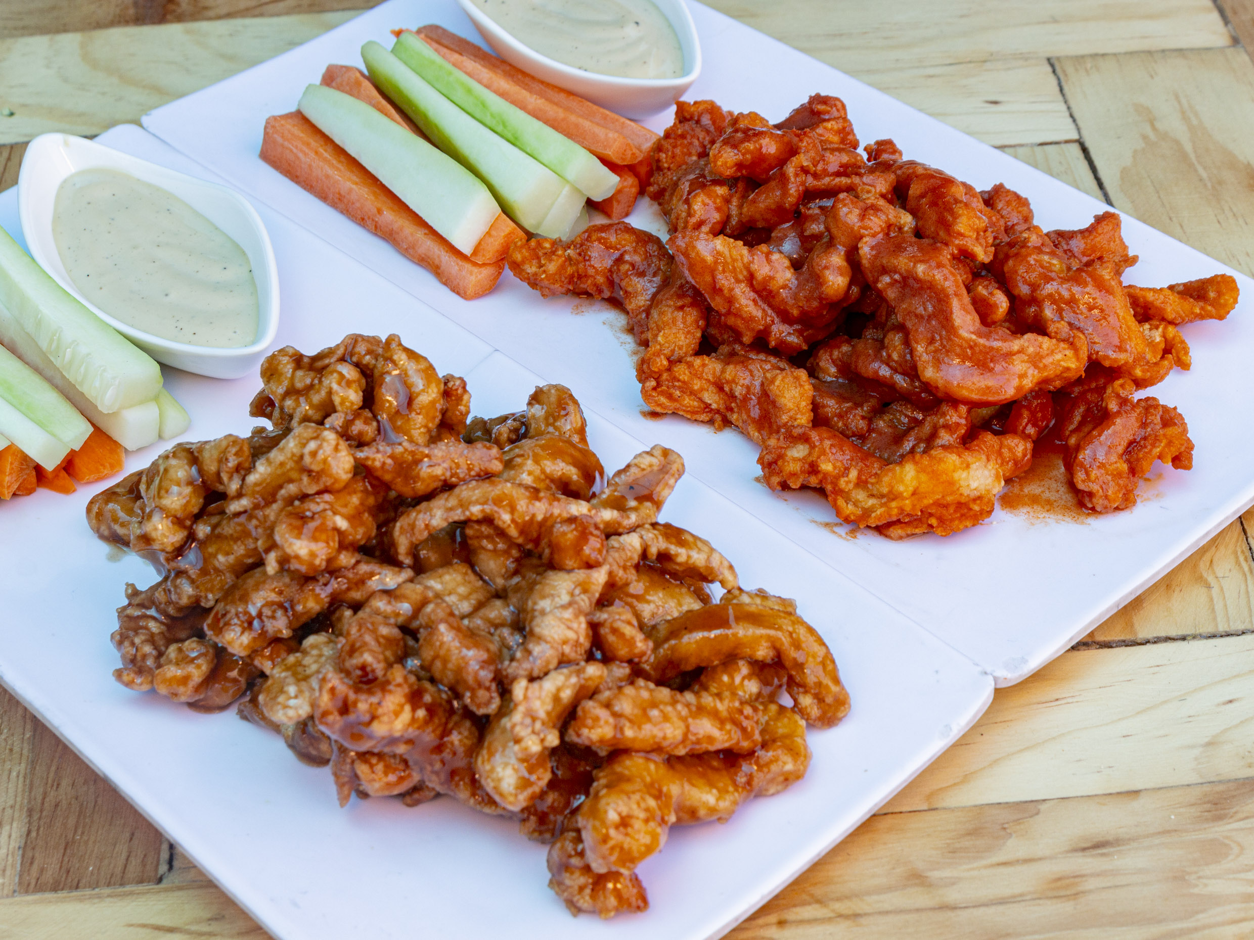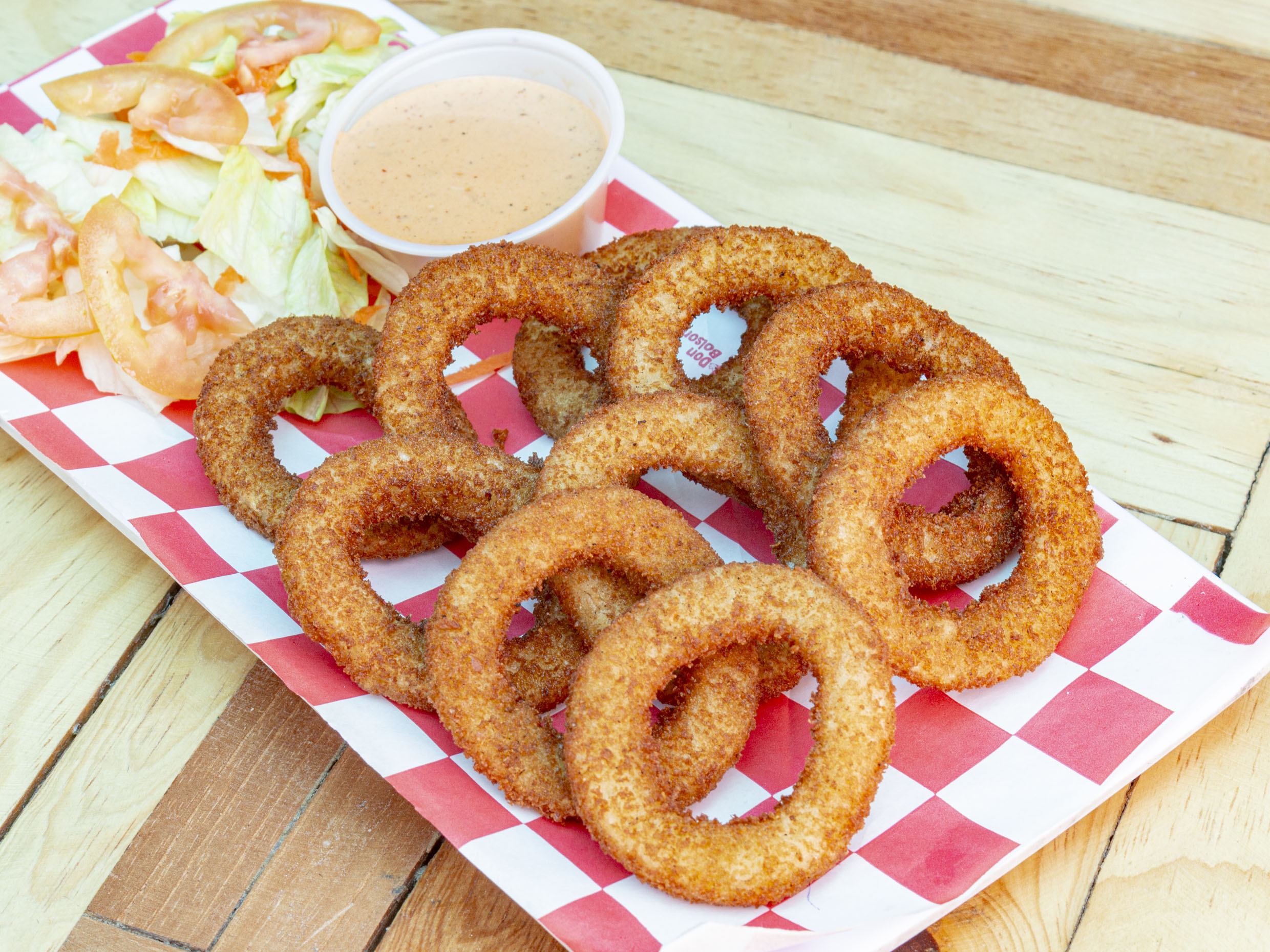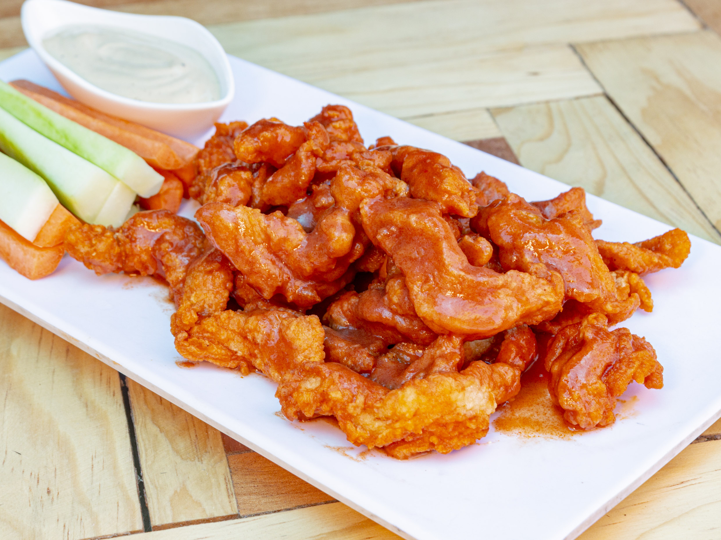 Pan hamburguesa, boneless (120 gr), zanahoria, tomate, lechuga y aderezo, acompañada con papas sazonadas.
