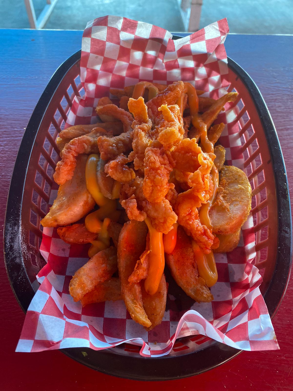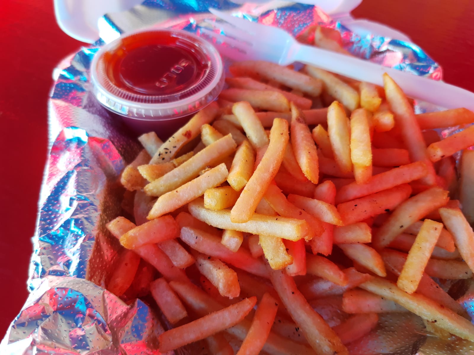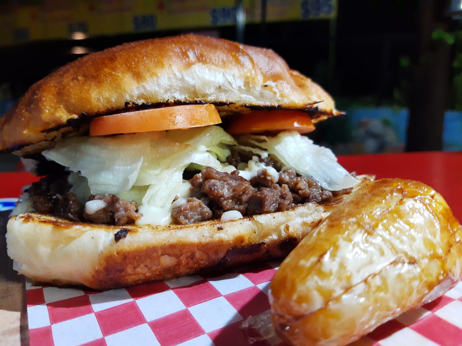 Carne artesanal de la casa(120gr), lechuga, tomate, queso amarillo, catsup, acompañada con papas ala francesa (100gr)