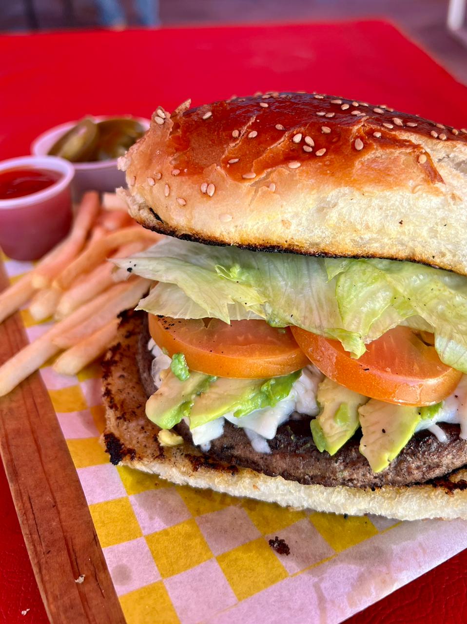 Pan hamburguesa con queso amarillo, carne de arrachera (150gr), lechuga, tomate, aguacate, con papas a la francesa (100gr).