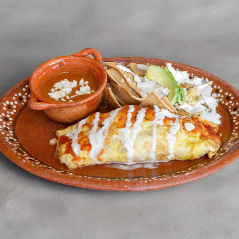 PAR DE HUEVOS REVUELTOS DENTRO DE TORTILLAS DE MAIZ Y BAÑADOS CON CREMA DE FRIJOL, CHORIZO, CREMA Y QUESO FRESCO