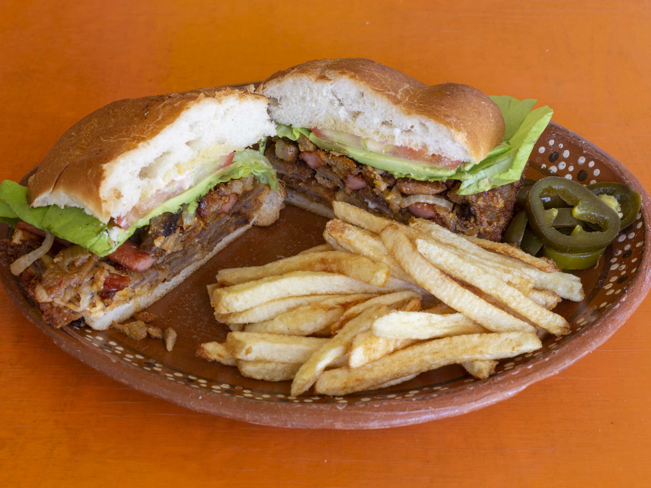 Torta de carne al pastor acompañada de su guarnición de papas a la francesa