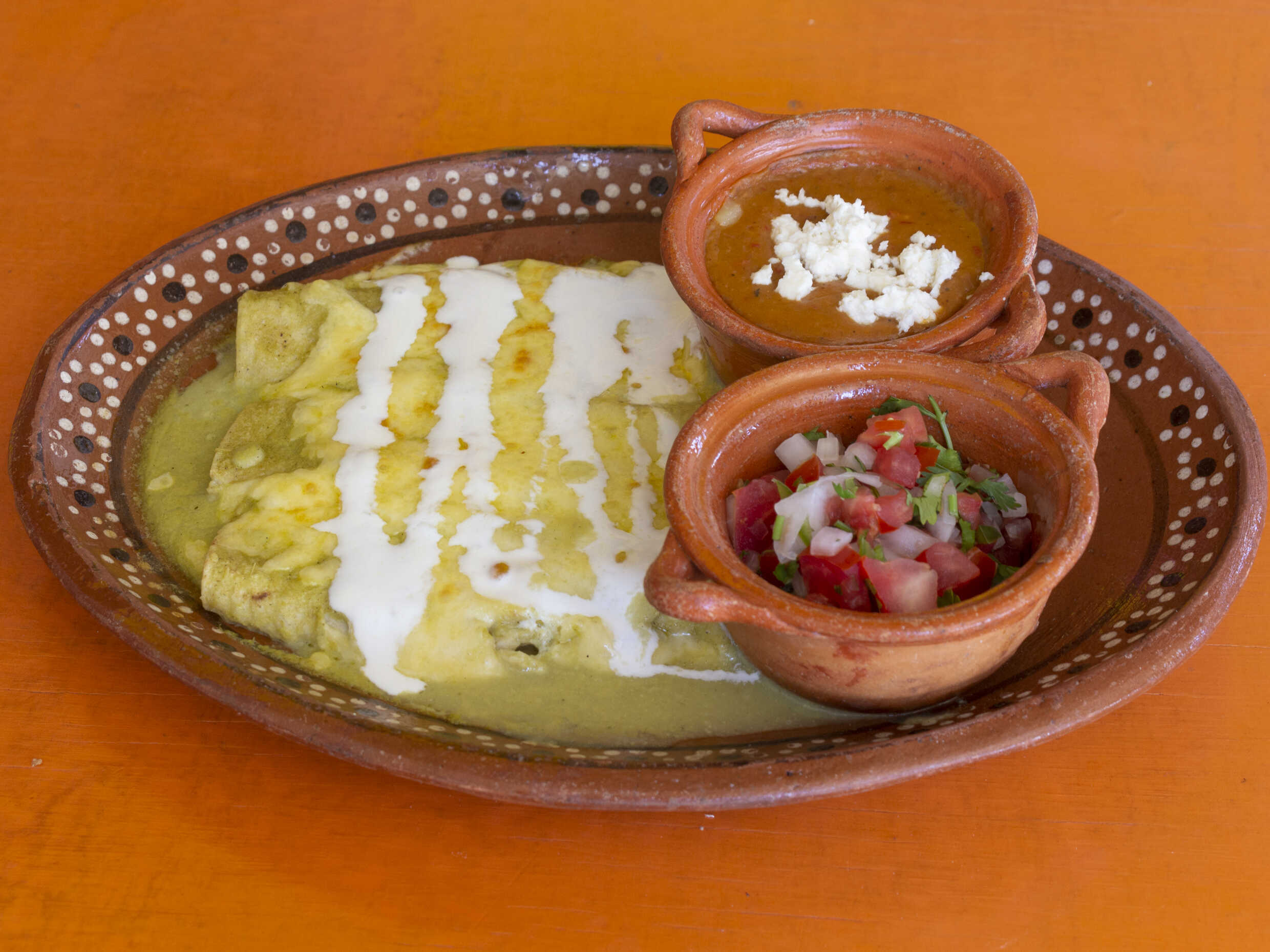 3 tortillas de maiz enrolladas rellenas de pollo, bañadas en salsa verde cremosa y gratinadas, acompañadas con frijoles