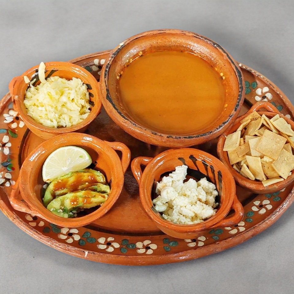 Caldillo rojo acompañado de cuadros de tortilla frita, queso fresco, queso Chihuahua, crema y toque de chipotle