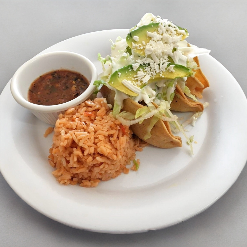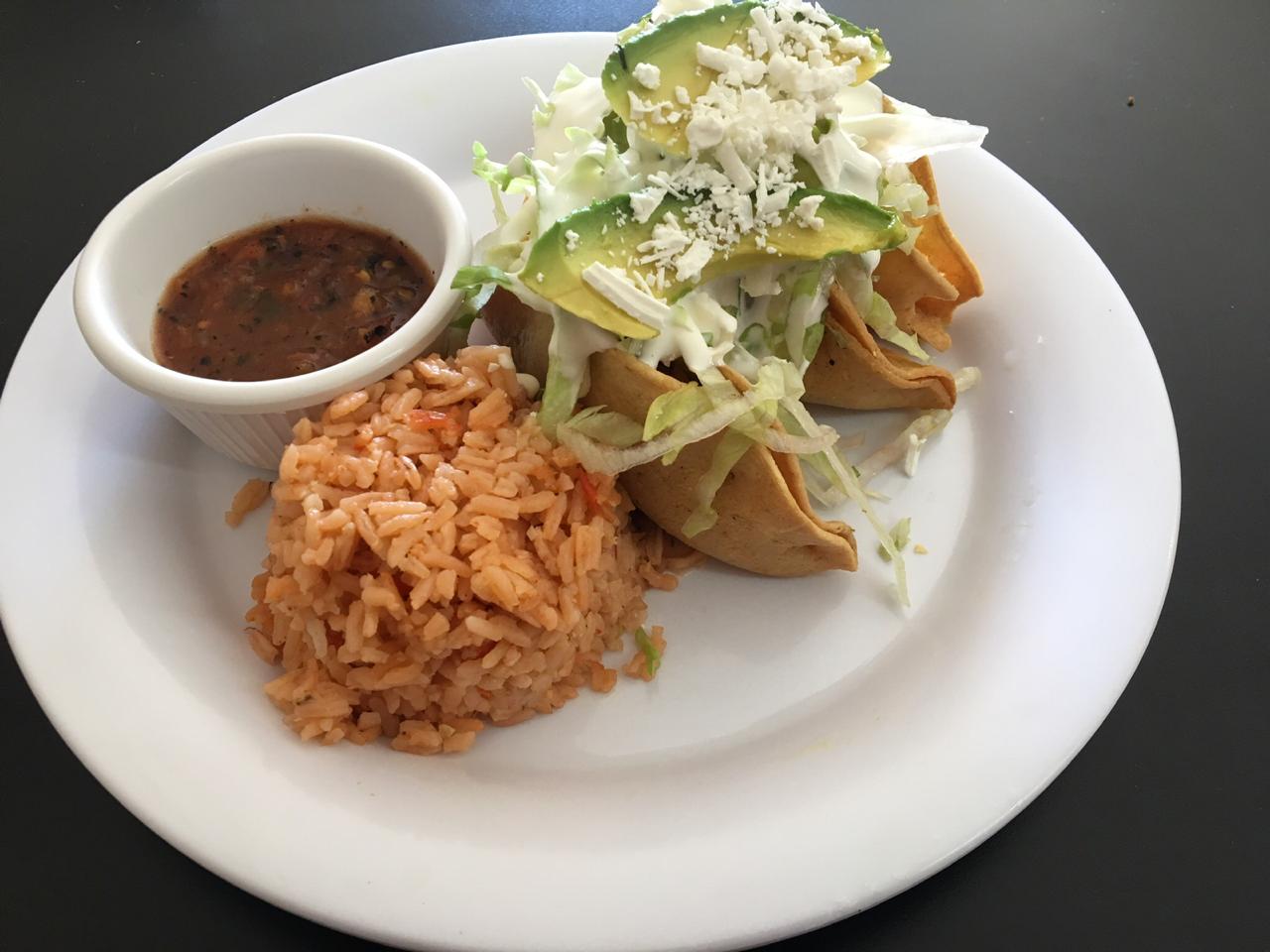 3 piezas de tacos dorados, acompañados de arroz y frijoles