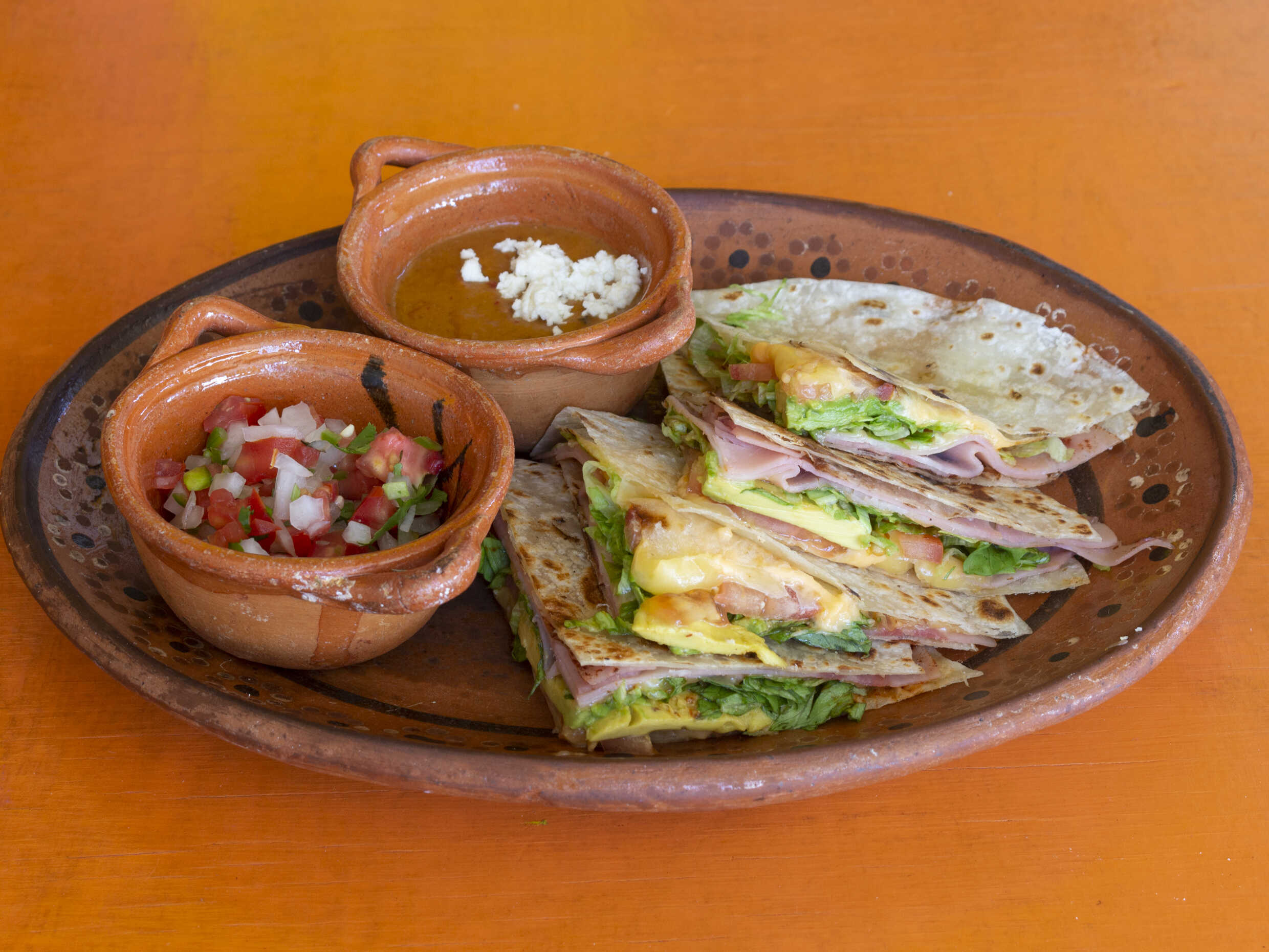 2 tortillas de harina rellenas de jamon y queso amarillo, lechuga, jitimate, aguacate y toque de chipotle por dentro acompañadas de frijoles