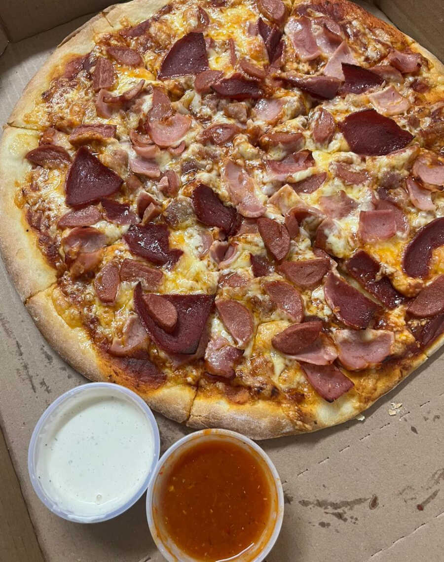 Pizza de carnes frías (queso, salami, tocino, salchicha y jamón) de 14 pulgadas.