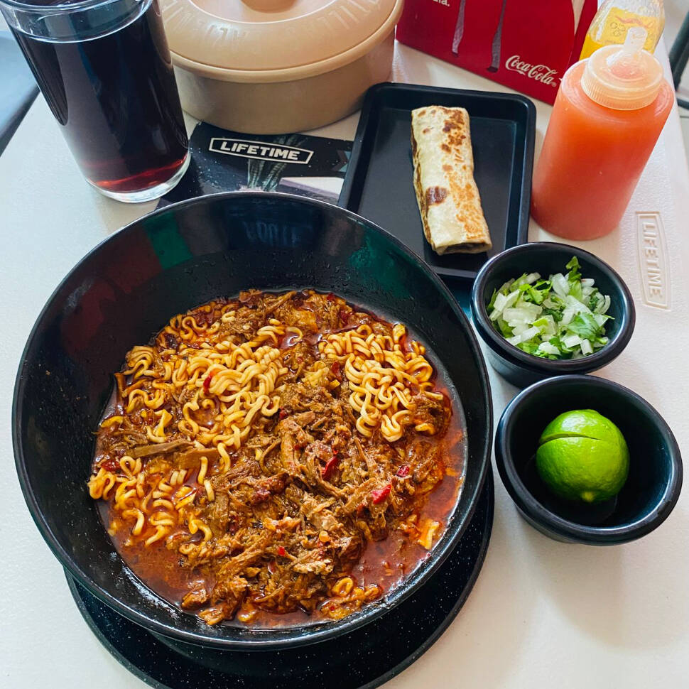 caldo con birria de res y pasta ramen. Incluye tortillas, agua de la casa, cebolla, cilantro, chiltepines y burrito de frijol.