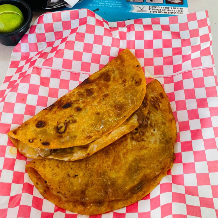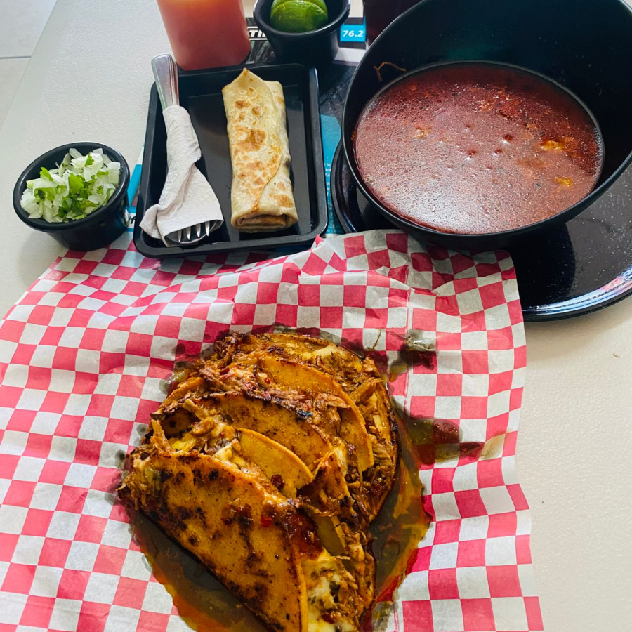 3 quesadillas con birria de res en tortilla de maíz. Incluye agua de la casa, cebolla, cilantro, chiltepines, jugo bichi y burrito de frijol.