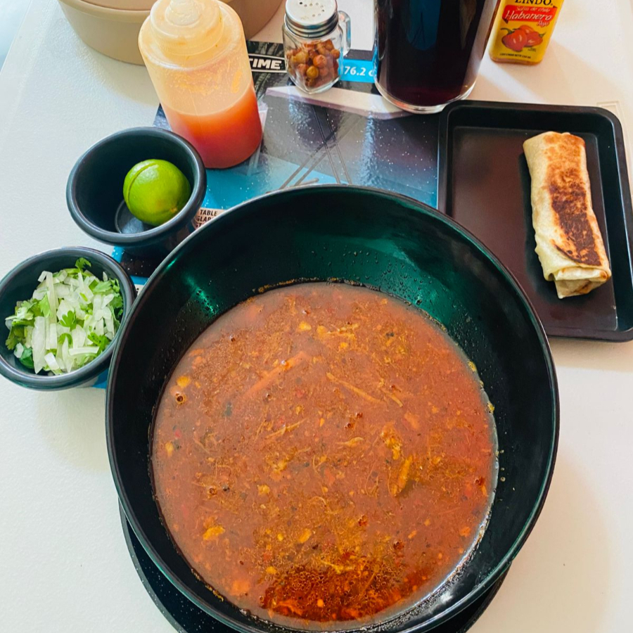caldo con birria de res. Incluye tortillas, agua de la casa, cebolla, cilantro, chiltepines y burrito de frijol.