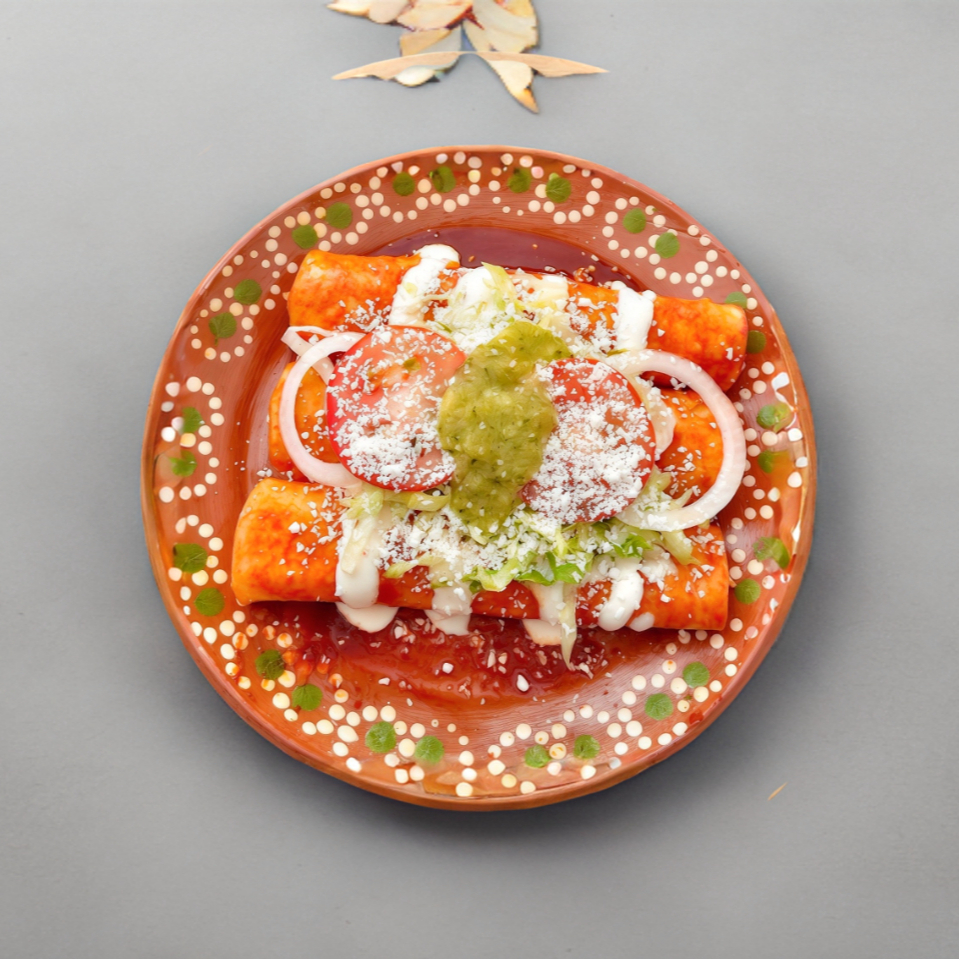 CUATRO ENCHILADAS CON RELLENO DE QUESO. ACOMPAÑADAS DE FRIJOL Y SALSA ROJA.