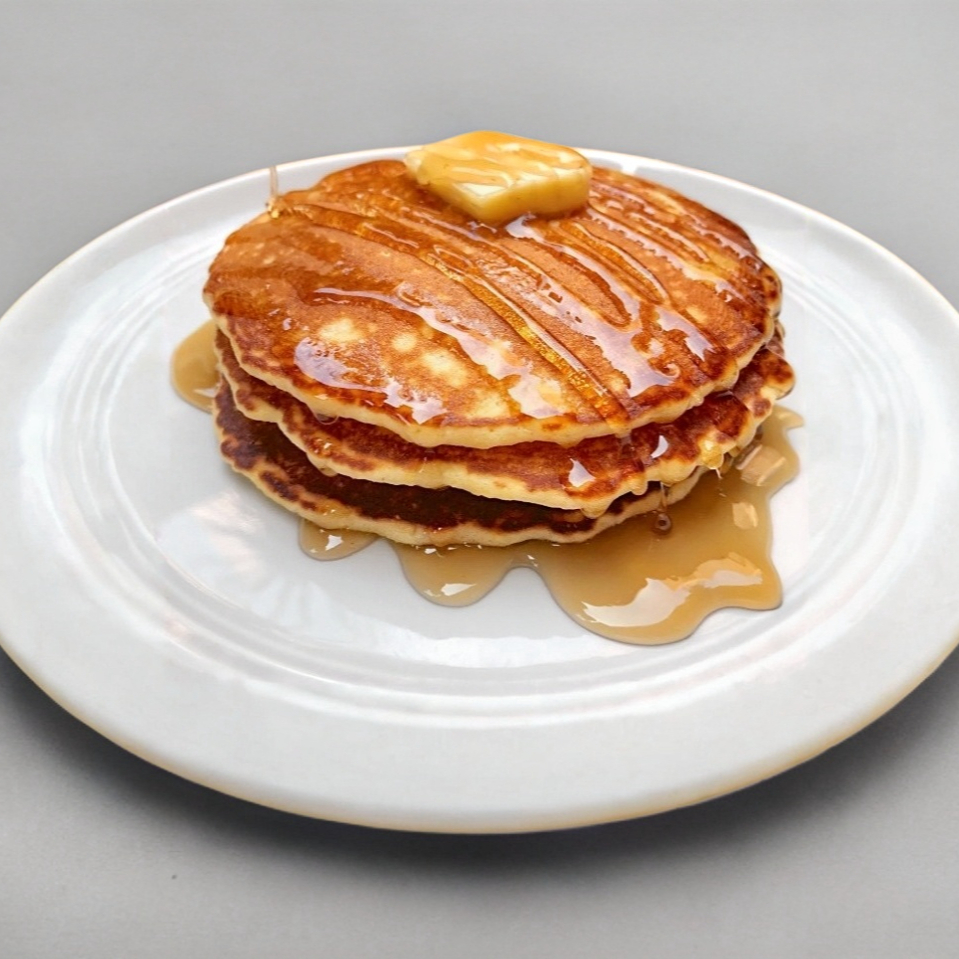 TRES HOT CAKES CON PLÁTANO, MIEL Y MANTEQUILLA.