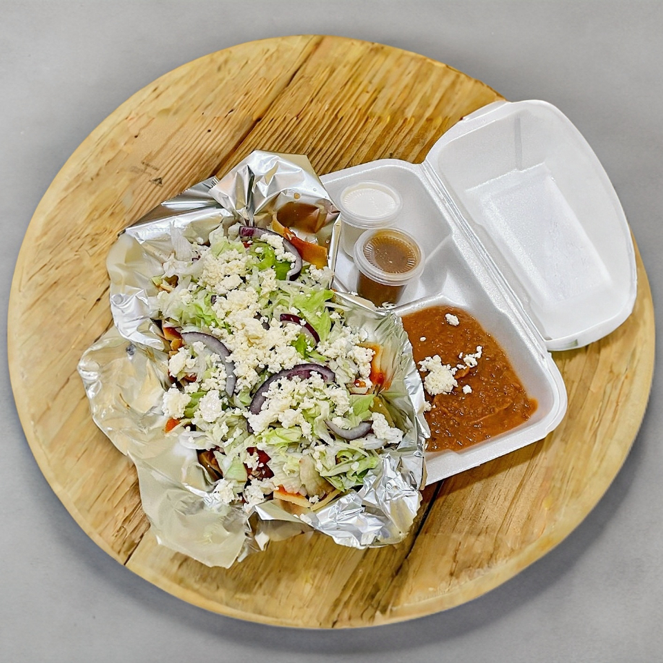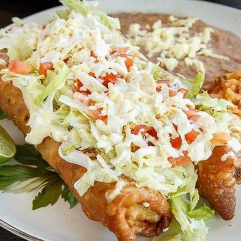 TRES CHIMICHANGAS DE PAPAS CON CARNE, VERDURAS, QUESO Y CREMA. ACOMPAÑADOS DE FRIJOL Y SALSA DE LA CASA.