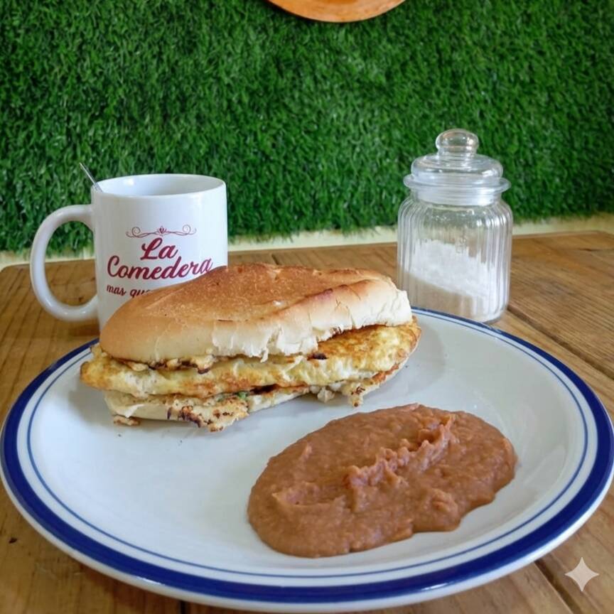 OMELETTE CON QUESO EN TORTA, DORADA EN MANTEQUILLA CON ADEREZO DE LA CASA, ACOMPAÑADO DE FRIJOL.
