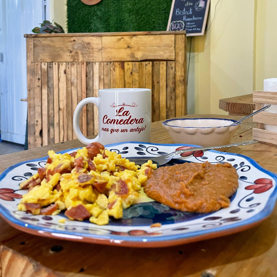 HUEVOS AL GUSTO DE MACHACA, CHORIZO , SALCHICHA, JAMÓN, O A LA MEXICANA, ACOMPAÑADOS DE FRIJOL, TORTILLAS DE MAÍZ Y SALSA DE LA CASA.