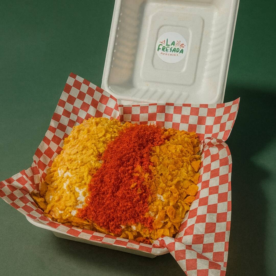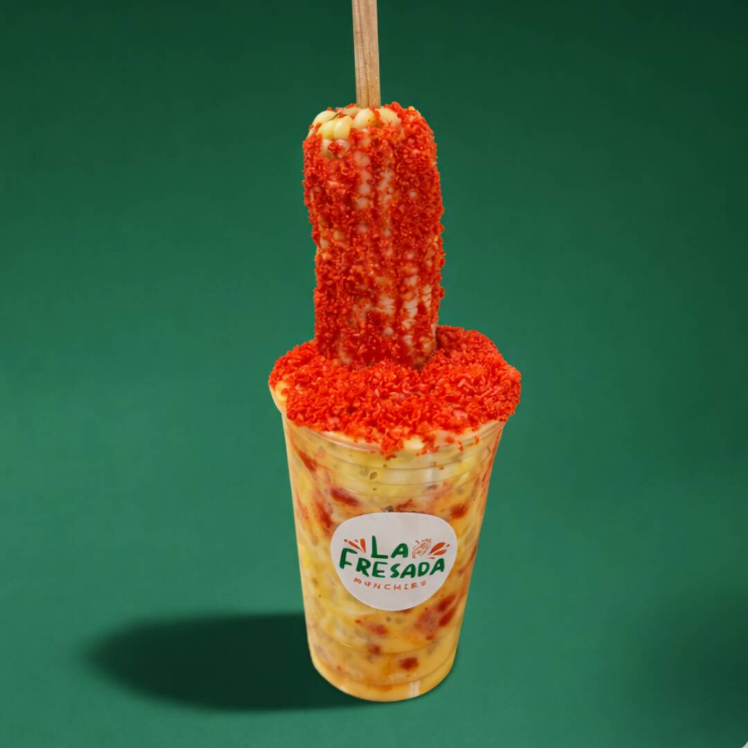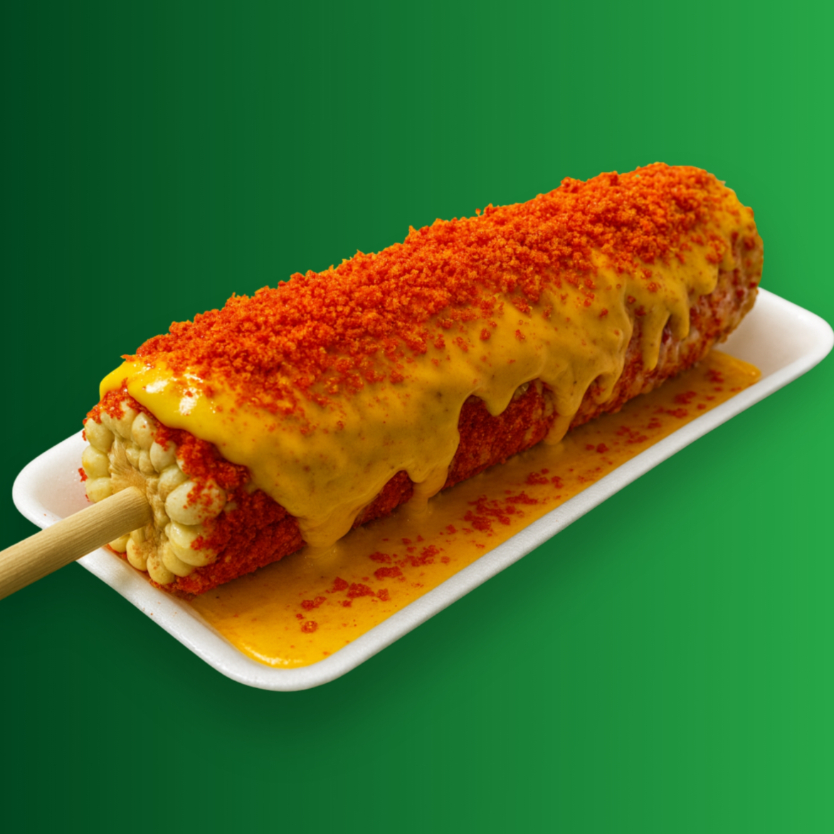 Cheetos flamin hot en capas con elote desgranado preparado y queso amarillo, coronado con elote entero cubierto de cheetos flamin molidos.