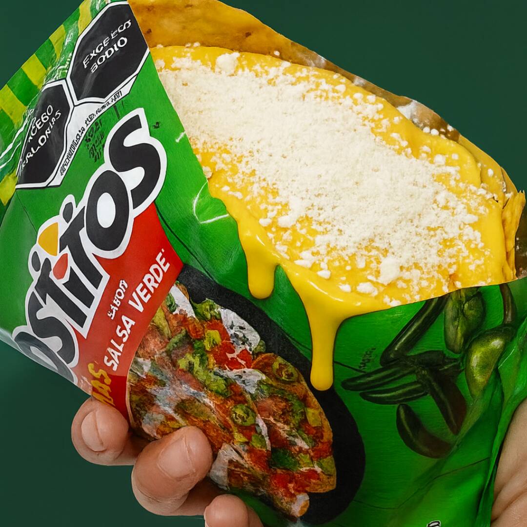 Bañado en queso amarillo, mantequilla, crema, mayonesa, queso blanco, topping de sabritas molidas a elegir.