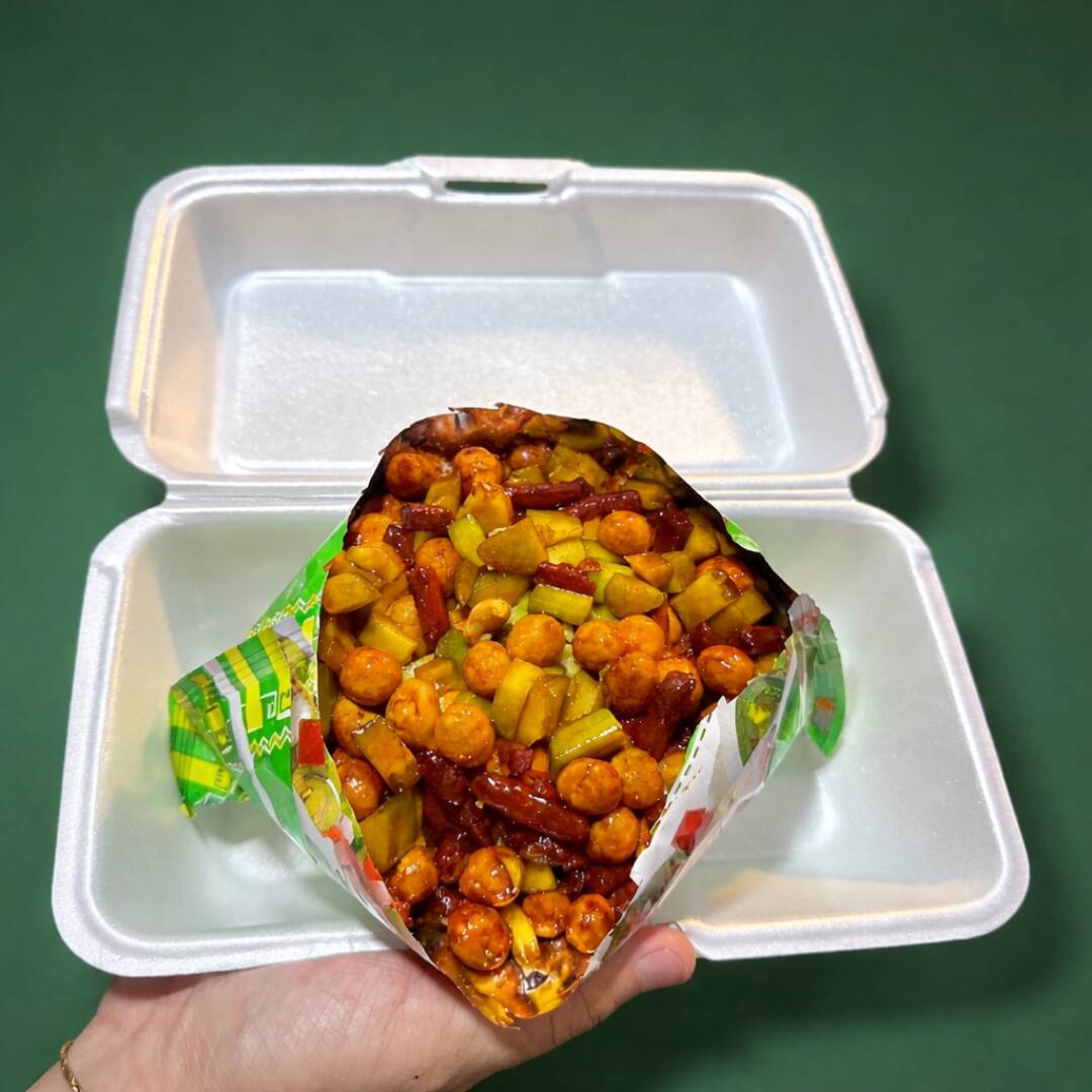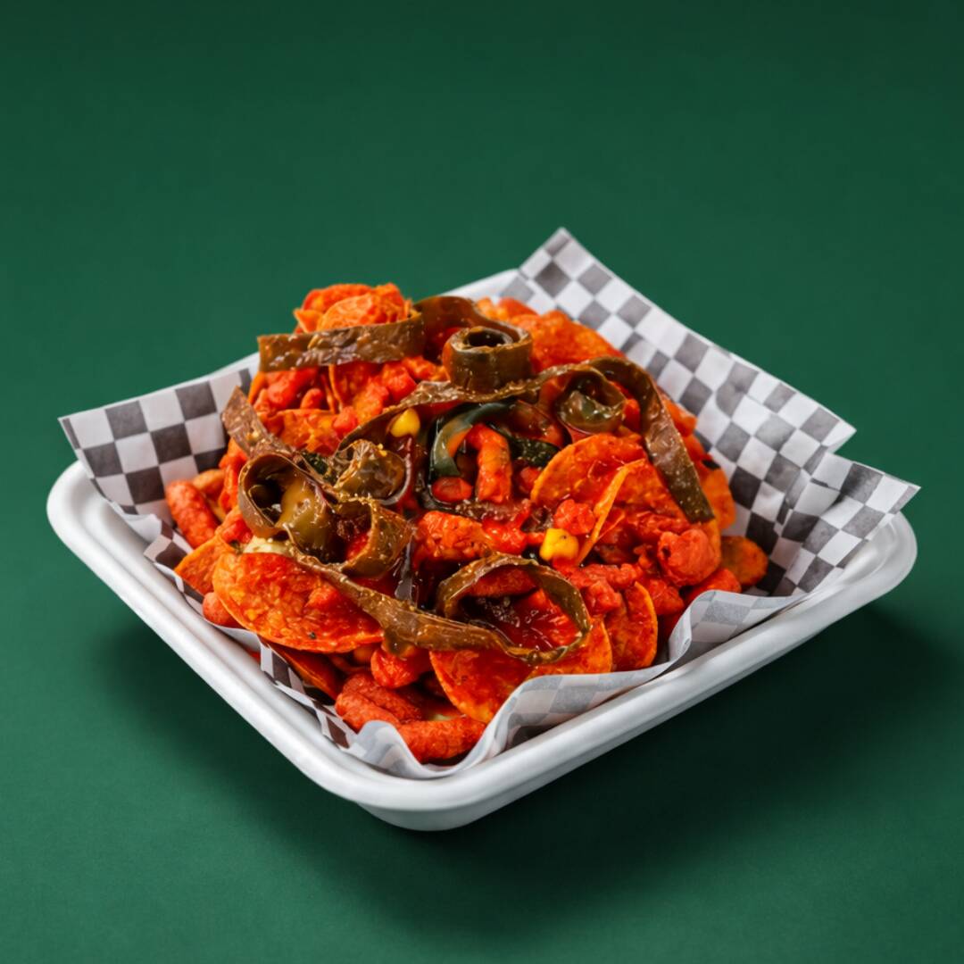 Base de sabritas a elegir, ramen buldak a elegir, elote, mantequilla, mayonesa, crema, queso amarillo, queso blanco, 3 toppings a elegir.
