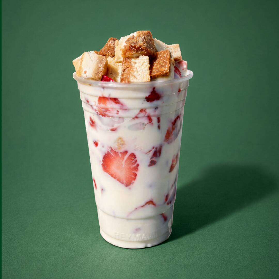 Vaso con crema lotus, fresa natural, crema preparada y topping de galleta lotus espolvoreada.