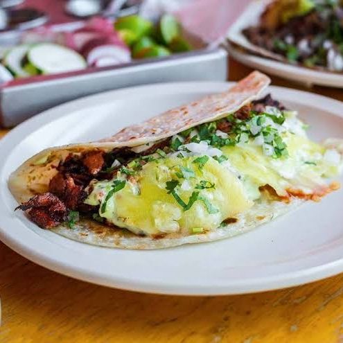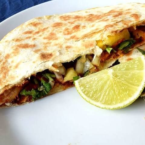 Tortilla de harina o maiz con carne adobada de cerdo a la plancha y queso chihuahua, tortilla dorada o blanda (verdura y salsa adicional).