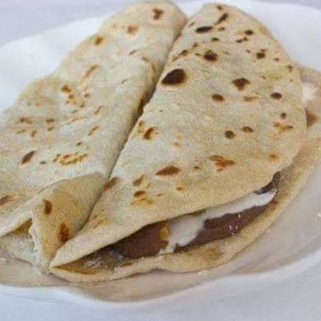 Tortilla de harina con queso chihuahua y frijol refrito.