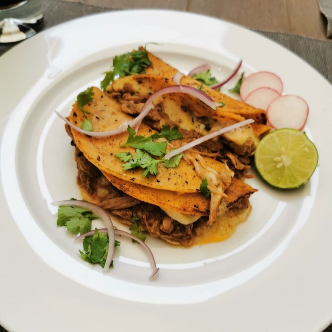 Quesadilla con birria y adobada (verdura y salsa adicional).