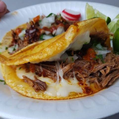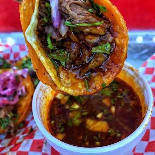 Tortilla de maíz con birria de res, tortilla dorada o blanda (verdura y salsa adicional).