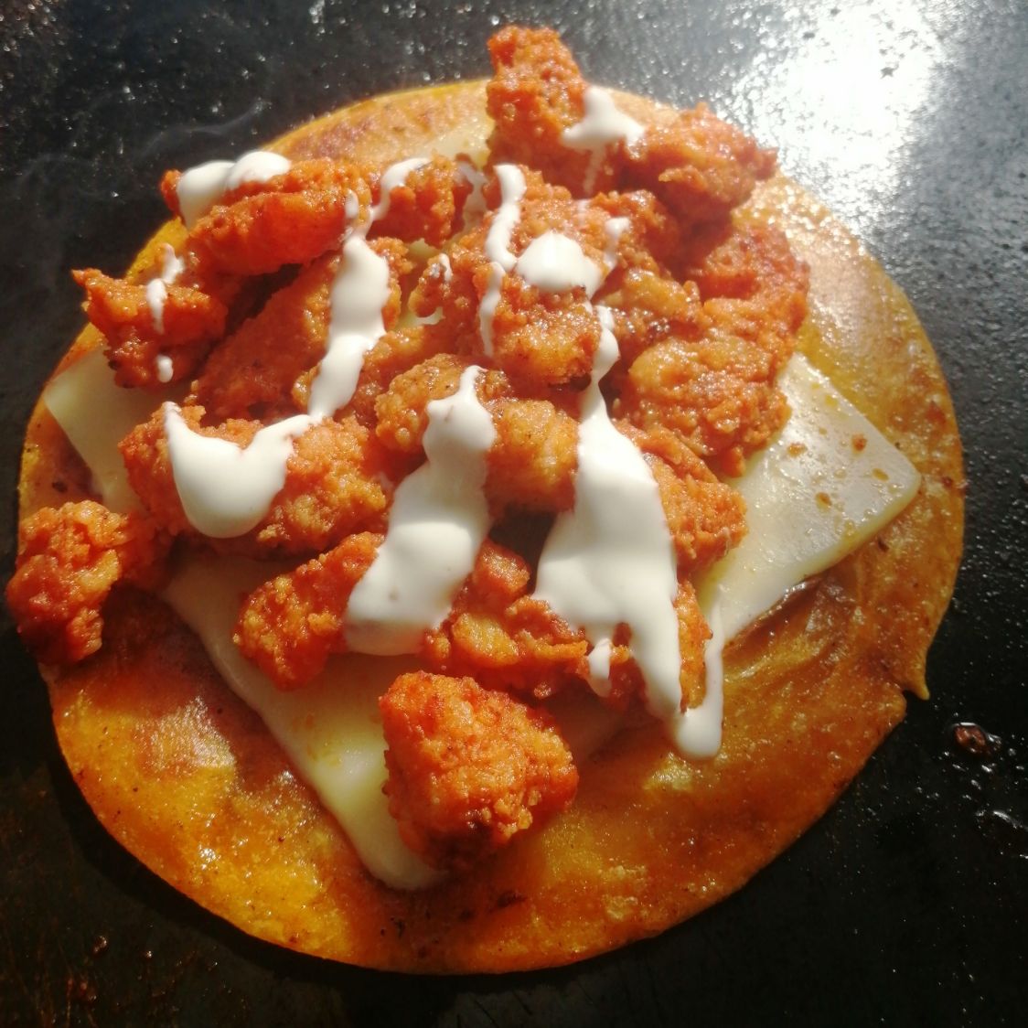Tortilla de maiz con boneless de pollo bañado en salsa buffalo o BBQ y queso chihuahua, tortilla dorada o blanda (verdura y aderezo adicional).